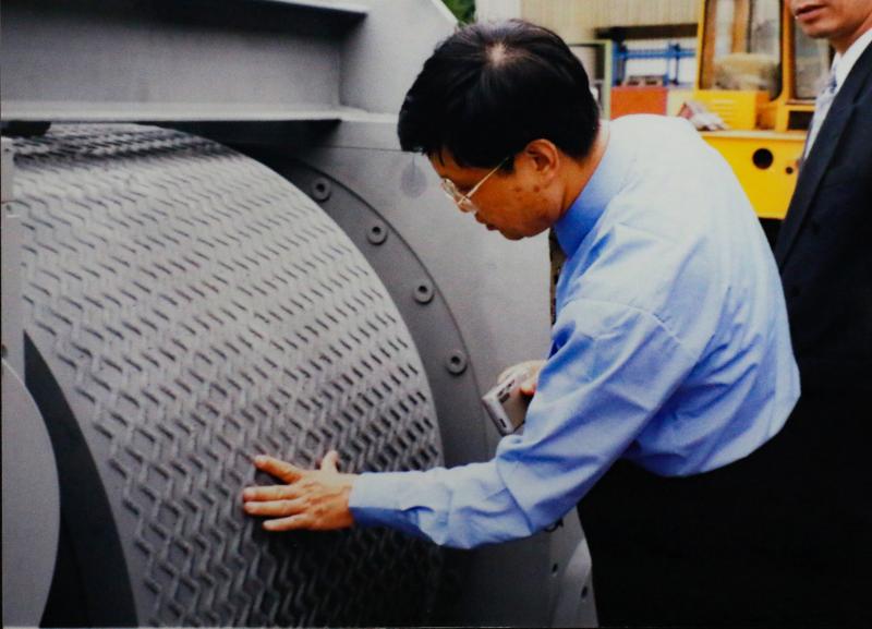 1999年,od体育网址技术专家和领导们出国考察交流学习。图为粉磨专家包玮在研究辊压机设备。