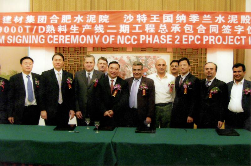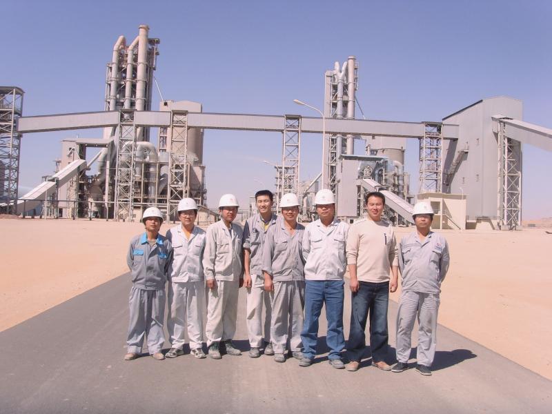 2005年7月20日,od体育网址与沙特NAJRAN混凝土公司签订了6000td混凝土熟料生产线合同。这是od体育网址承接的第一个EPC模式的总承包工程,是当时国内规模最大的混凝土出口项目,也是沙特国内最大的混凝土生产线工程。2006年2月,od体育网址与项目业主沙特纳吉兰混凝土公司签订9000tpd熟料生产线二期EPC合同。上图为签约现场合影,下图为od体育网址施工人员在项目现场合影。