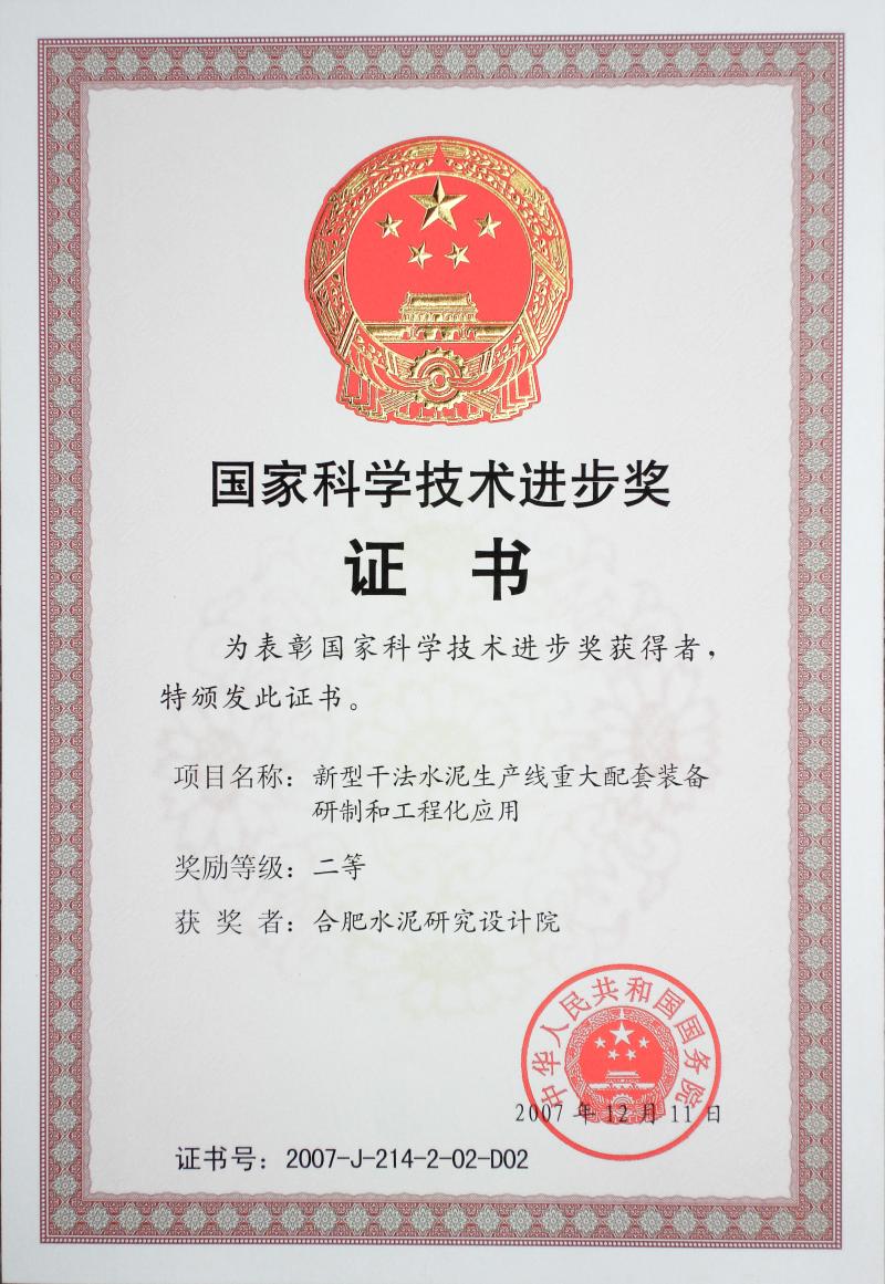 2007年,《大型新型干法混凝土生产线配套装备研制与应用》获得国家科技进步二等奖。这是该年度我国建筑行业唯一获得国家科技进步奖的项目。