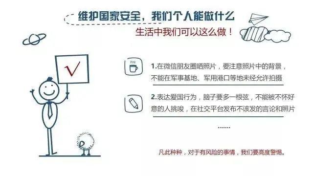 在微信朋友圈晒照片,要注意照片中的背景,不能在军事基地、军用港口等地未经允许拍摄;表达爱国行为,脑子要多一根弦,不能被不怀好意的人挑唆,在社交平台发布不该发的言论和照片。