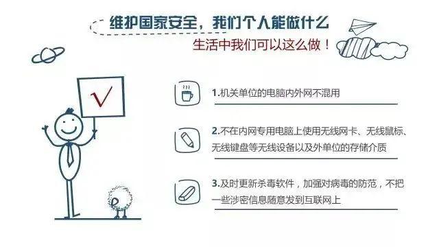 机关单位的电脑内外网不混用不在内网专用电脑上使用无线网卡、无线鼠标、无线键盘等无线设备以及外单位的存储介质。及时更新杀毒软件,加强对病毒的防范,不把一些涉密信息随意发到互联网上。