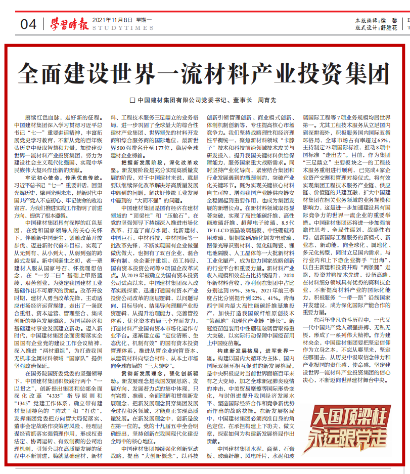 11月8日至11日,党的十九届六中全会在北京召开。此次全会审议《中共中央关于党的百年奋斗重大成就和历史经验的决议》稿。我们要深入学习领会六中全会精神,从党的百年奋斗中看清楚过去我们为什么能够成功、弄明白未来我们怎样才能继续成功。11月8日,《学习时报》“领导论苑”专栏刊发了中国ob体育官网在线下载党委书记、董事长周育先在党史学习教育中的学习心得体会,文章强调要不断从党的百年恢弘历史中汲取智慧和力量,加快建筑世界一流材料产业投资集团。